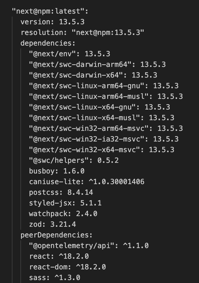 우선 현재 프로젝트에 설치된 각 패키지의 구체적인 버전 정보를 알아야 한다. npm을 사용한다면 package-lock.json, yarn을 사용한다면 yarn.lock 파일에서 설치된 구체적인 버전을 확인할 수 있다. yarn.lock 파일을 기준으로는 다음과 같이 확인해볼 수 있겠다.