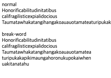 기본값인 normal과 달리, 이 속성을 break-word로 줄 경우 줄을 바꿀 만한 중단점이 없음에도 임의의 지점에서 줄바꿈이 발생할 수 있게 된다. Non-CJK 언어의 예시는 다음과 같다.