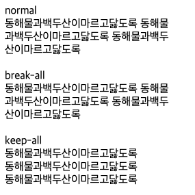- word-break 텍스트가 자신의 콘텐츠 박스 밖으로 오버플로 할 때 줄을 바꿀 것인지 지정