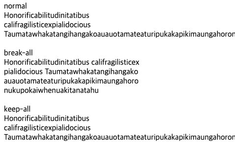 기본값인 normal과 달리, 이 속성을 break-word로 줄 경우 줄을 바꿀 만한 중단점이 없음에도 임의의 지점에서 줄바꿈이 발생할 수 있게 된다. Non-CJK 언어의 예시는 다음과 같다.