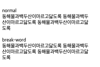 위 텍스트를 기본인 normal 속성으로 두면 다음과 같이 음절이 나뉘는 어떤 곳이든지 소프트 줄바꿈이 가능하다. break-all, break-word로 속성을 정의하는 경우에도 동일하다.