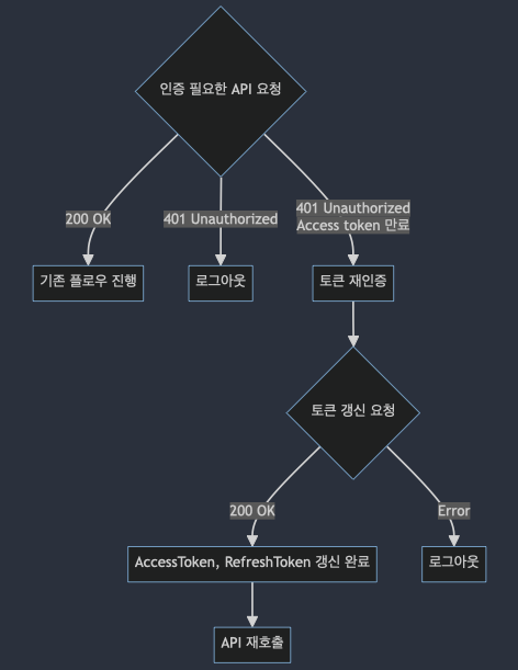보통 유저 인증이 필요한 API는 제한되어 있으나, 인증을 처리하는 로직은 공통으로 수행된다. 리소스를 수정하거나, 생성하는 등의 액션을 요구하는 요청은 인증 과정을 거쳐 본래 요청을 처리하게 된다. 유저의 권한이 없거나 토큰이 만료되는 등 인증에 실패하는 경우, 서버에서는 인증에 실패했다는 공통 응답을 제공할 것이다. 이때 HTTP 요청/응답 과정에서 Axios Interceptor 를 사용하면 클라이언트에서 인증을 관리하기 용이해진다. 이번에는 토큰 만료 시 서버에 토큰 갱신 요청을 통해 새로운 토큰을 발급받고, 원래 들어온 HTTP 요청을 다시 요청하는 로직이 필요한 경우를 가정하여 Axios API 재요청을 구현하는 방법을 소개해보고자 한다. 인증 처리 플로우는 다음과 같다.