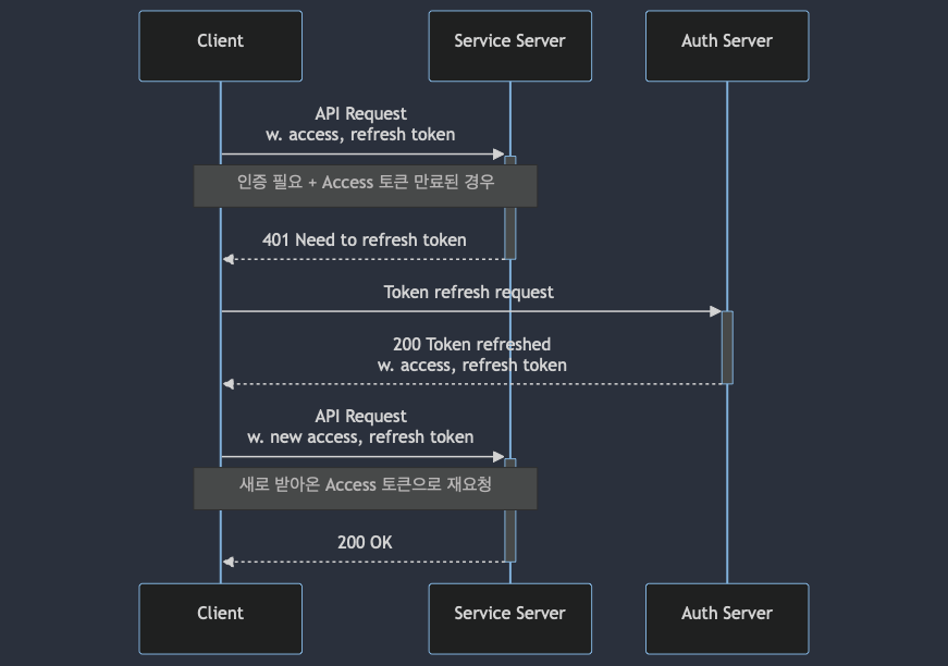 엑세스 토큰이 만료된 경우, 클라이언트에서 가지고 있는 리프레시 토큰으로 엑세스 토큰을 재발급한 뒤, 갱신된 토큰으로 본래 요청을 다시 보내는 방법이 있다. 이때 리프레시 토큰까지 만료되었을 경우 토큰 갱신에 실패할 것이기 때문에 자동으로 로그아웃 처리 등 에러 핸들링을 해주는 것이 중요하다.